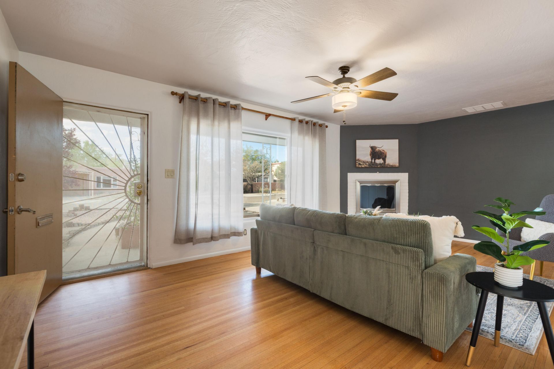 Welcome to this bright, beautiful, move-in ready single-story home just minutes to Nob Hill and UNM. The light-filled living area is anchored by a cozy wood burning fireplace and striking accent wall, creating a natural gathering space, while large windows bring in soft natural light. Gleaming, original hardwood flooring adds warmth and character throughout. The layout connects seamlessly to the dining area and kitchen, where abundant shaker-style cabinetry, durable solid-surface counters, stainless appliances, and a breakfast bar make everyday living and entertaining effortless. Enjoy the comfort of refrigerated air for optimal climate control this summer. Situated on an expansive .24-acre lot with a huge backyard and lush, mature trees, shade, privacy, and room to truly enjoy the space.